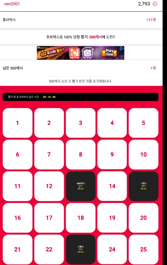 4. 500캐시 뽑기 매번 5개 튜브 박스가 소모됩니다.
