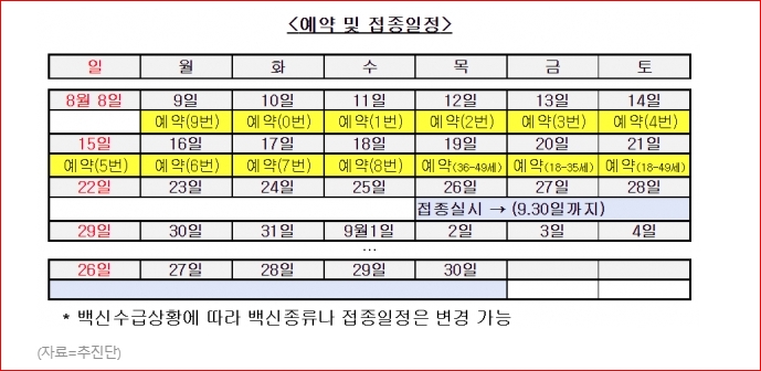 주요 접종 대상별 접종계획은 우선 40대 이하 연령층(약 1,777만 명)에 대해서는 10부제에 따라 정해진 날짜에 개별 사전예약 후 접종을 실시할 계획이다. 사전예약 10부제는 8월 9일(월)부터 18일(수)까지 주민등록번호 생년월일 끝자리를 기준 10개 대상군으로 진행된다.